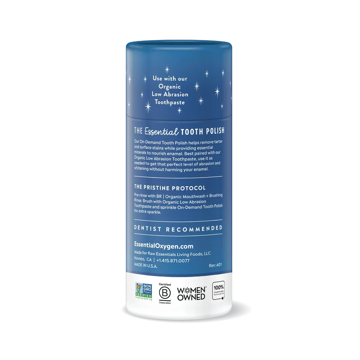 Essential Oxygen On-Demand Tooth Polish is better than ever with new 100% biodegradable, FSC certified packaging, plus a clean-pour dispensing feature! It’s the same smile-loving formula, now in planet-friendly style.