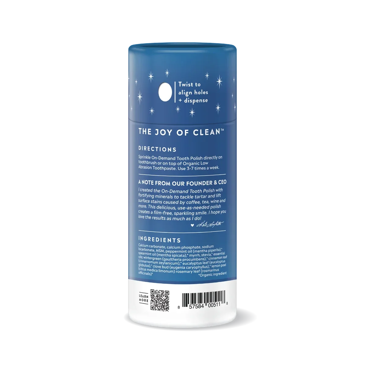 Our On-Demand Tooth Polish is back with improved 100% biodegradable, FSC certified packaging and a clean-pour dispenser. Featuring the same effective formula, it helps remove tartar and surface stains while delivering essential minerals to support and nourish enamel.